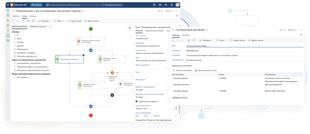 - Гибкая no-code настройка процессов и маршрутов работы с документами.