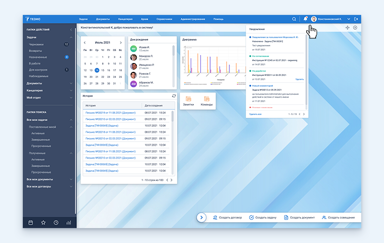 СЭД ТЕЗИС — платформа для управления документооборотом и задачами — объединяет инструменты для настройки бизнес-процессов и автоматизации обработки документов. Поддерживает интеграцию с внешними сервисами, ERP и электронными подписями, а также работу через веб-клиент и мобильные устройства.